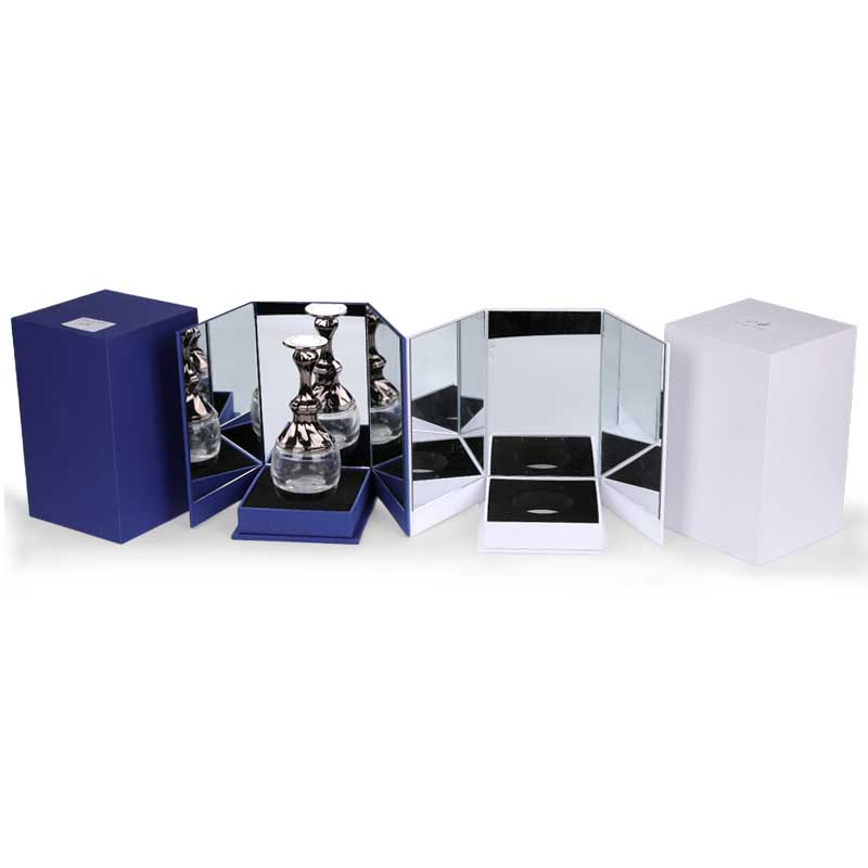 Tento parfumový box sa vyznačuje inovatívnou vlastnosťou zrkadiel nainštalovaných na troch stranách vo vnútri krabice, ktorá používateľom ponúka komplexný vizuálny zážitok. Či už obdivuje fľašu parfumov z rôznych uhlov po otvorení škatule alebo po jej zatvorení odraz, zrkadlový dizajn dodáva pohodlie a pôžitok. Krabica, ktorá je vyrobená z špeciálneho papiera s rozmermi 120 GSM s 2 mm modrou doskou, obsahuje zrkadlá a EVA s kŕdľovým interiérom doplneným tlakom CMYK, strieborným nárazom a vyrazením na vonkajšej strane prémiového remeselného spracovania a vizuálnej príťažlivosti. Tento návrh nielen zvyšuje vnímanú hodnotu produktu, ale tiež zvyšuje používateľskú skúsenosť. Je vhodný na balenie parfumov, kozmetiky a rôznych darčekov a remesiel. Každá objednávka je prispôsobiteľná tak, aby vyhovovala konkrétnym požiadavkám na zákazníka, čo poskytuje jedinečné riešenie balenia pre špičkové značky a luxusné produkty.